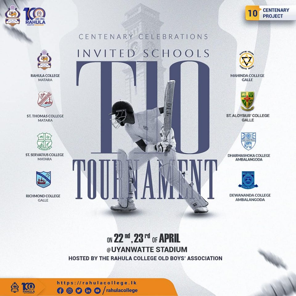 Centenary Celebrations Iinvited Schools Cricket T10 Tournament will be held on the 22nd and 23rd of April 2023 at the Uyanwatta Stadium, Matara.