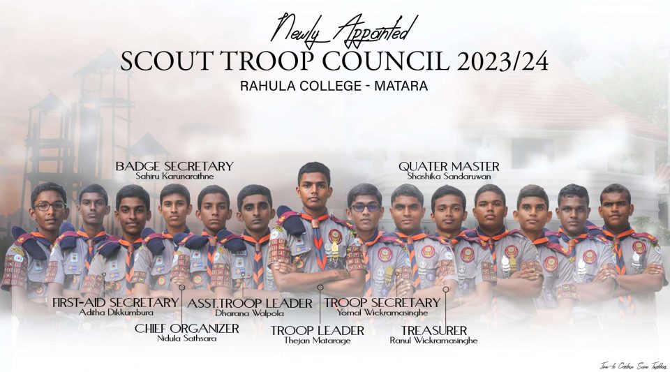 Troop Leader : Thejan Theekshana Matarage Asst. Troop Leader : Dharana Chamalpa Walpola Troop Secretary : Yomal Bimsara Wickramasinghe Chief Organizer : J.R.A.Nidula Sathsara Treasurer : Ranul Janandith Wickramasinghe Quater Master : S.M.P.Shashika Sandaruwan Badge Secretary : Sahiru Nimandith Karunarathne First – Aid Secretary : Aditha Pankaja Dikkumbura Committee Members : Kushan Achintha YapaS.M.P.Suhara Sujayana…