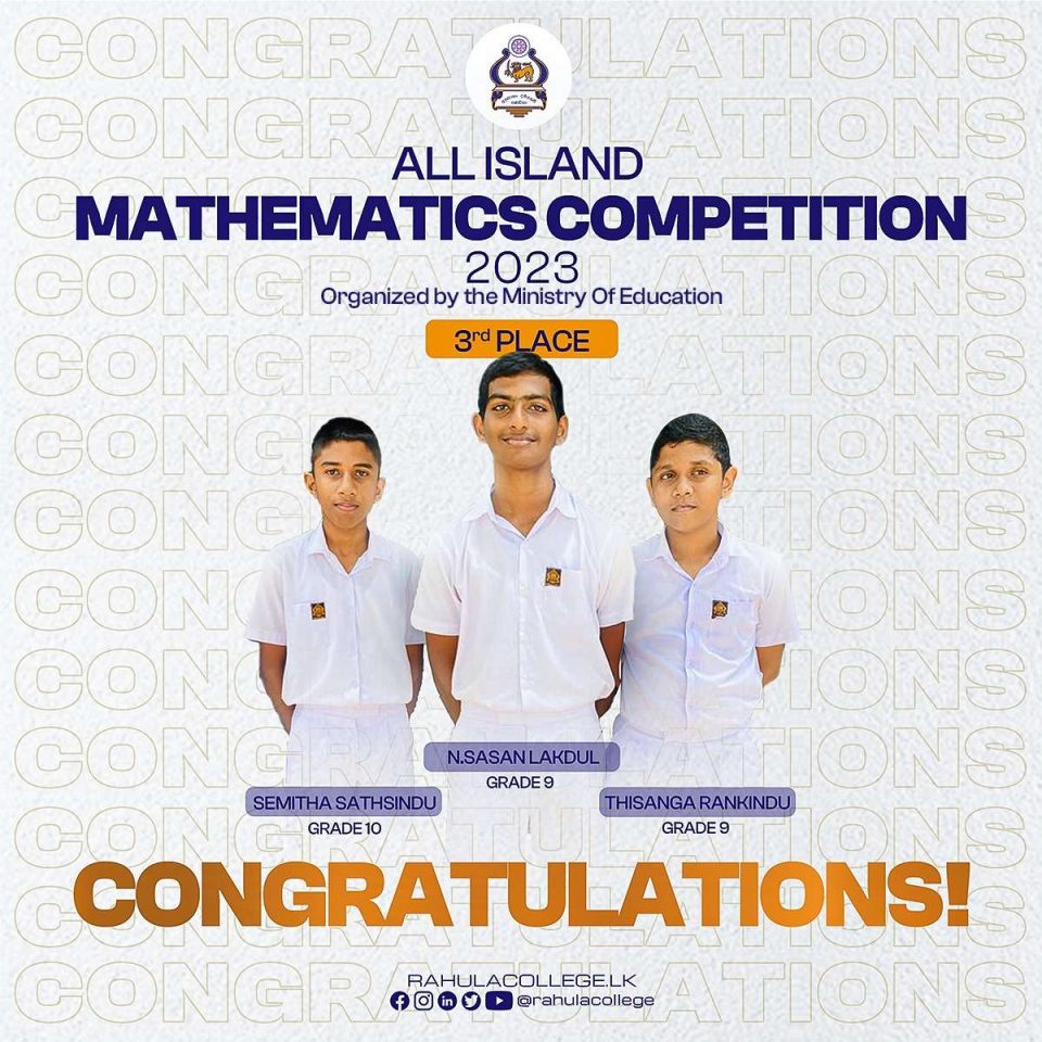 Congratulations Semitha Sathsindu, N. Sasan Lakdul and Thisanga Rankindu on winning the 3rd place in All Island Mathematics Competition 2023 Organized by the Ministry of Educatopn