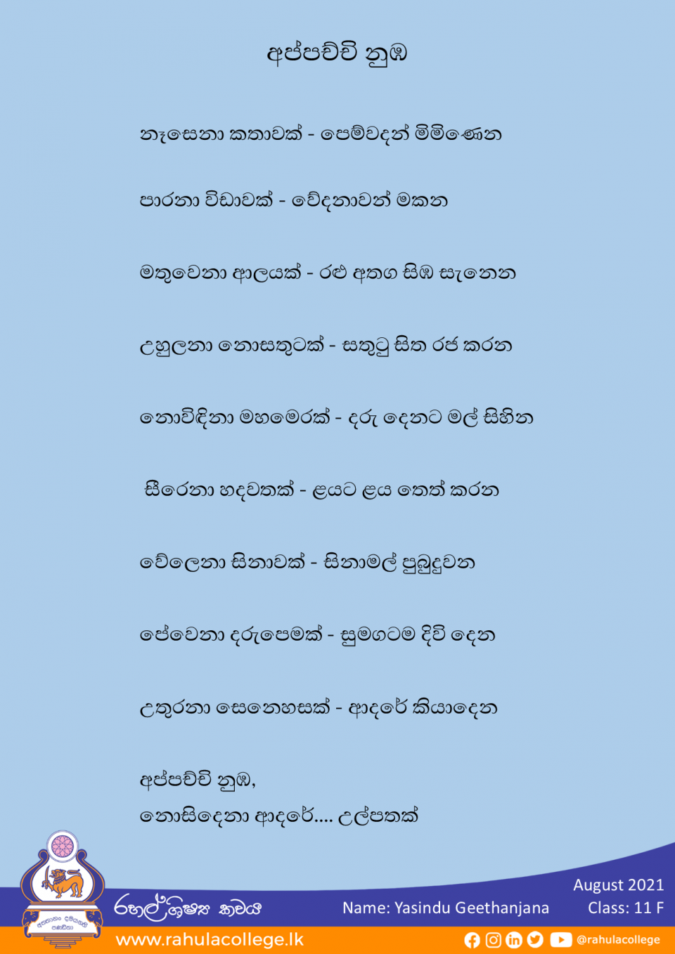 ZoomDetails අප්පච්චි නුඹPoetryBy K. P. D. MadhukaAugust 31, 2021Leave a commentYasindu Geethanjana Class: 11 F