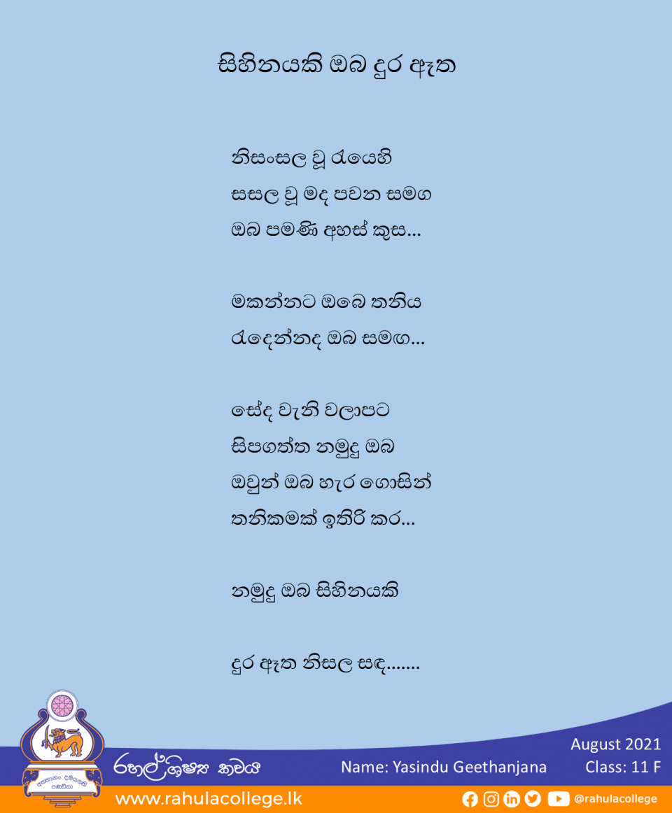 ZoomDetails සිහිනයකි ඔබ දුර ඈතPoetryBy K. P. D. MadhukaAugust 31, 2021Leave a commentYasindu Geethanjana Class: 11 F