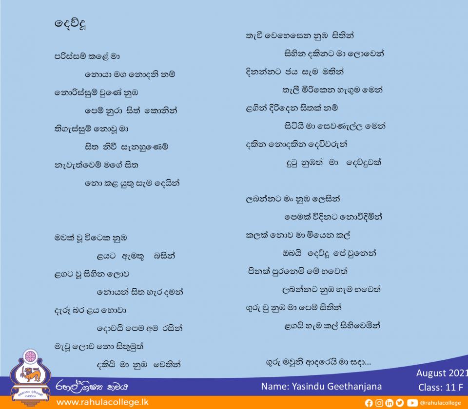 ZoomDetails දෙව්දූPoetryBy K. P. D. MadhukaAugust 31, 2021Leave a commentYasindu Geethanjana Class: 11 F