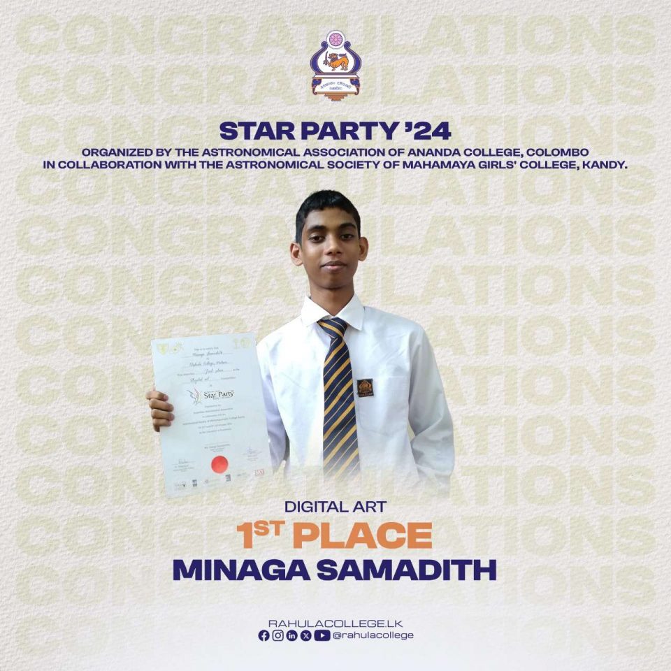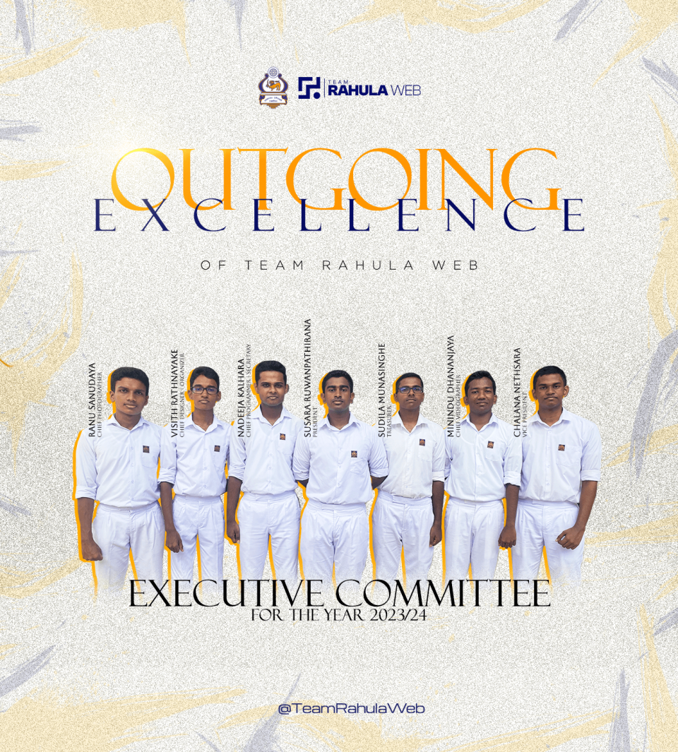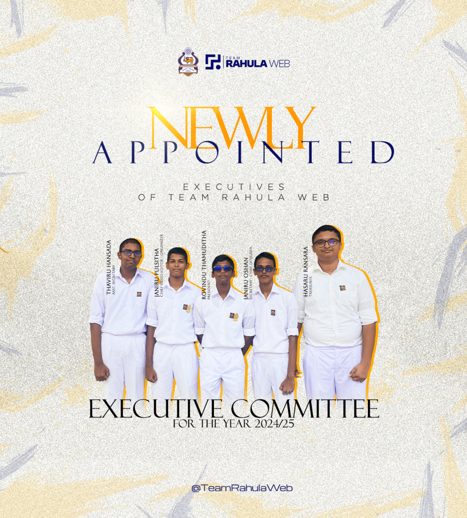 To continue the legacy of Team Rahula Web, backbone of the school that cherishes eternal moments of success, congratulations are in order for the newly appointed Executive Board of Team Rahula Web for the years 2024/25. President : Rovindu Thamuditha Secretary : Janiru Oshan Treasurer : Hasaru Ransara Organizer : Janiru Pulsitha Vice Secretary :…