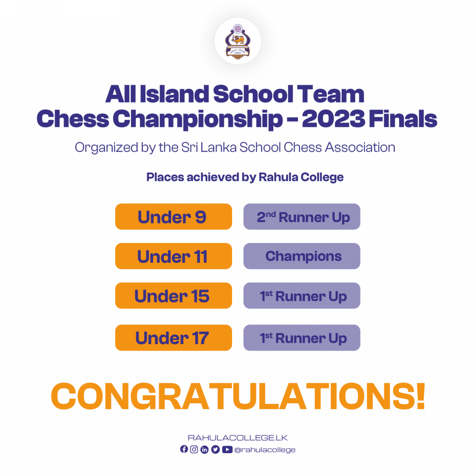All Island School Team Chess Championship 2023 Finals. Rahula College won Under 9 – 2nd Runner Up Under 11 – Champions Under 15 – 1st Runner Up Under 17 – 1st Runner Up