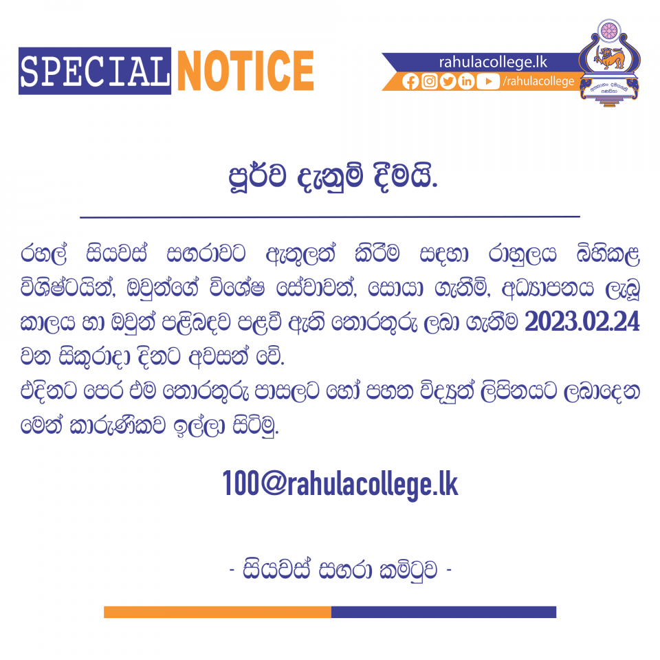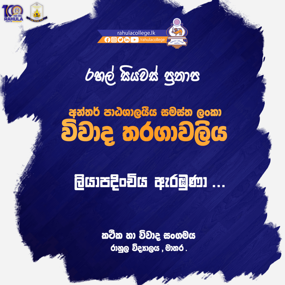 The Sinhala Debating Association of Rahula College is organizing “Rahal Siyawas Prathapa” inter-school all-island debating competition parallel with the centenary celebrations of the school. The first round of the competition will be started on the 5th and 6th of March 2023 and the Registrations will be closed on the 22nd of February. Please register through…