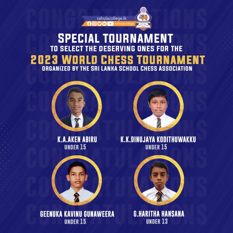 Aken Abiru, Dinujaya Kodithuwakku, Geenuka Gunaweera, and Haritha Hansana have been selected to take part in the world chess tournament 2023. The special tournament has been organized by the Sri Lanka schools chess association. Congratulations !