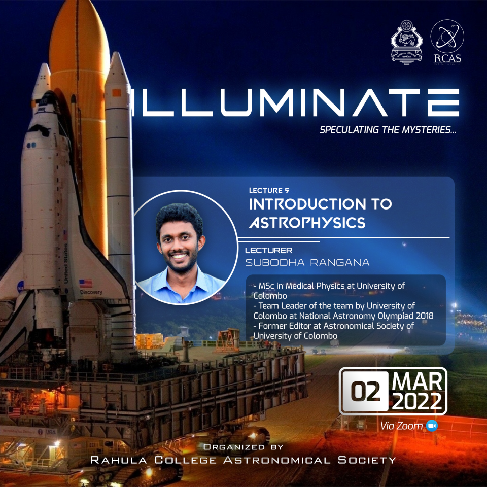 Mr. Subodha Rangana, a student at the Faculty of Science, University of Colombo is awaiting to host the final lecture of the series on “Introduction to Astrophysics” for our forever curious young Rahulians. Date : 02nd of March, 2022Time : 7.00 pm onwardsPlatform : Zoom Conference