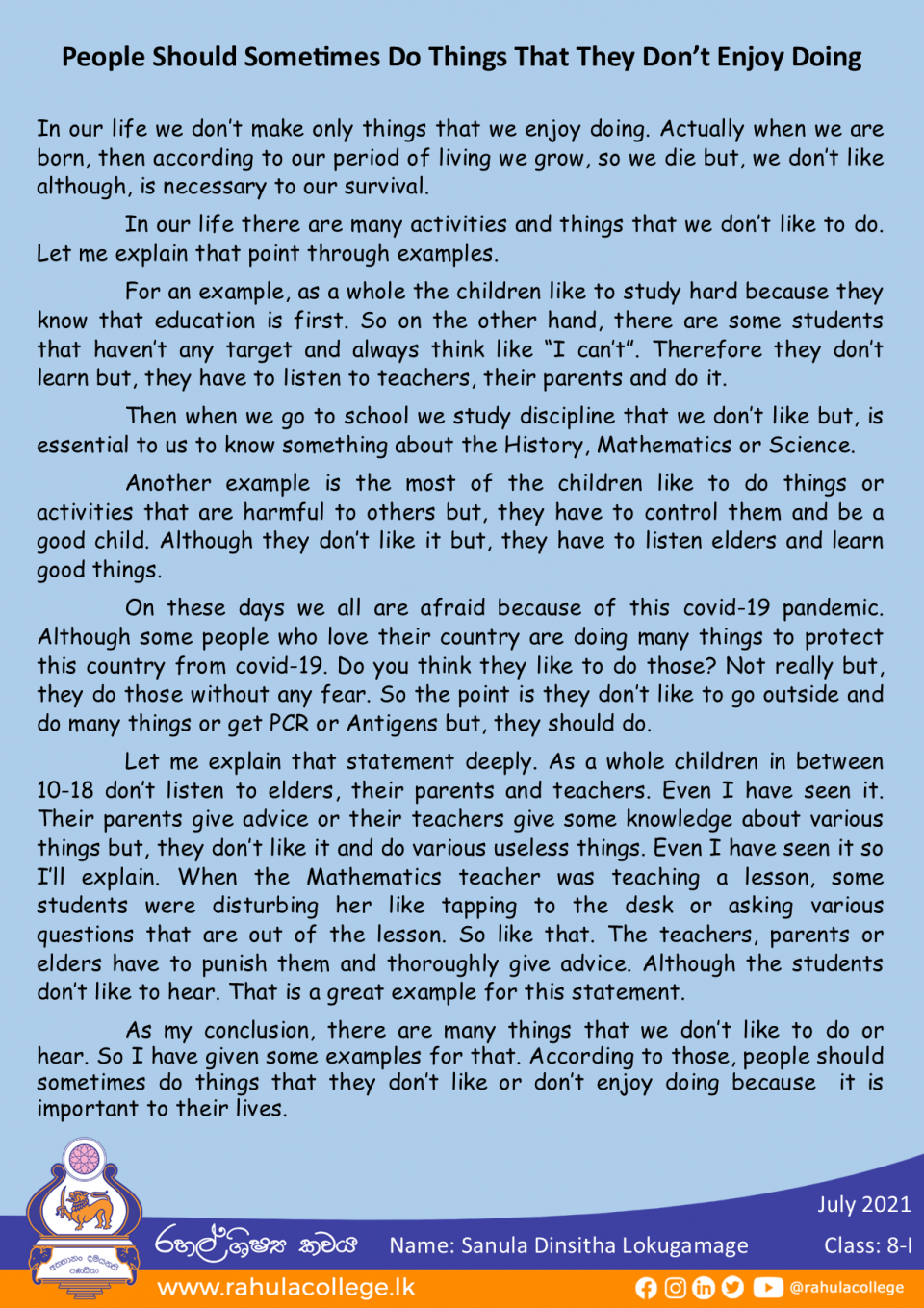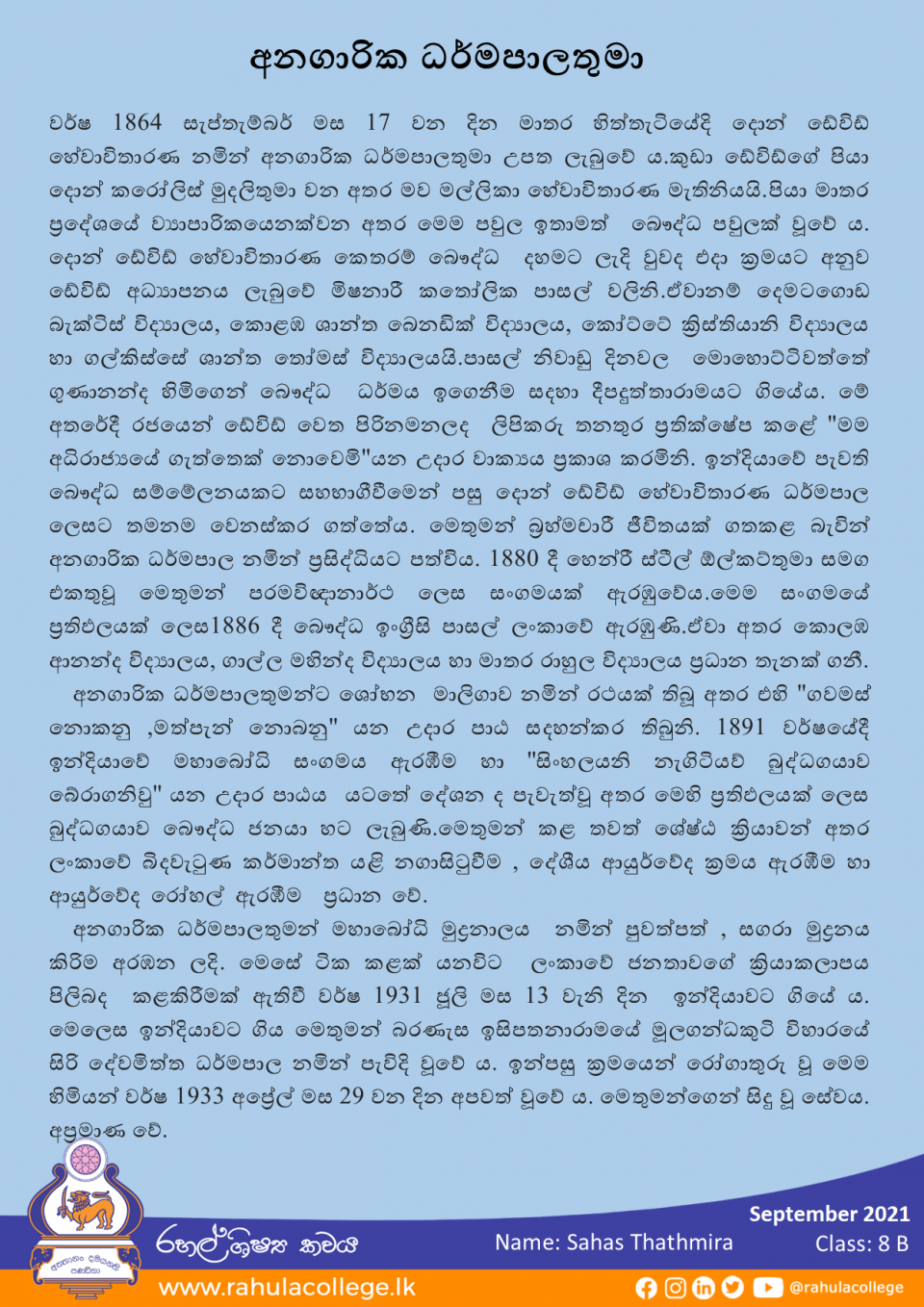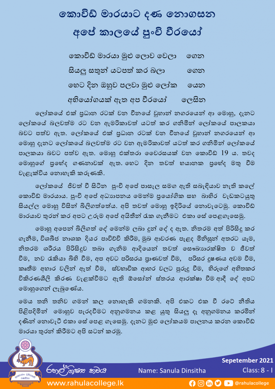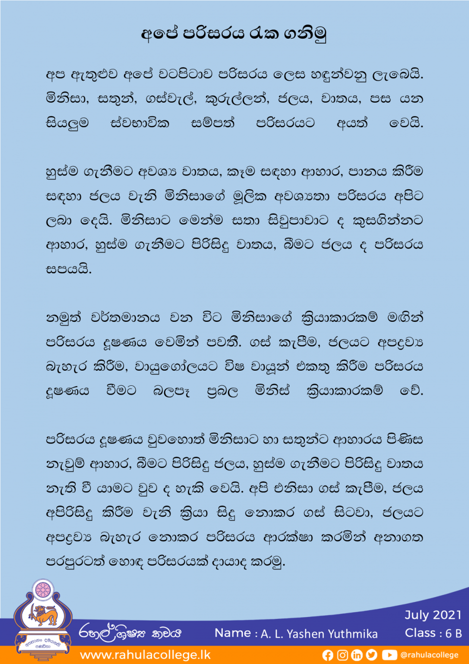A. L. Yashen Yuthmika Class: 6 B අප ඇතුළුව අපේ වටපිටාව පරිසරය ලෙස හඳුන්වනු ලැබෙයි. මිනිසා, සතුන්, ගස්වැල්, කුරුල්ලන්, ජලය, වාතය, පස යන සියලුම ස්වභාවික සම්පත් පරිසරයට අයත් වෙයි. හුස්ම ගැනීමට අවශ්ය වාතය, කෑම සඳහා ආහාර, පානය කිරීම සඳහා ජලය වැනි මිනිසාගේ මූලික අවශ්යතා පරිසරය අපිට ලබා දෙයි. මිනිසාට මෙන්ම සතා සිවුපාවාට ද කුසගින්නට ආහාර, හුස්ම…