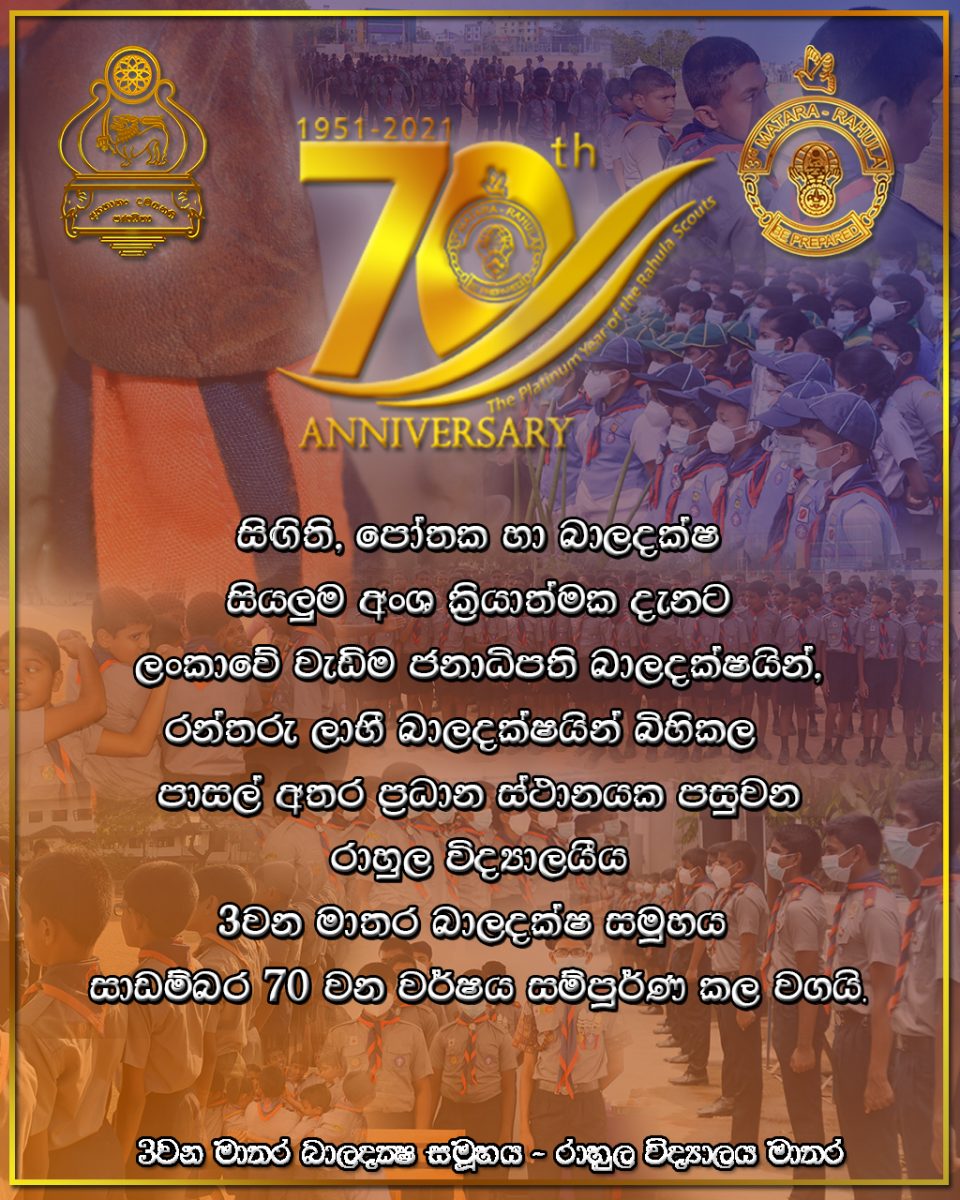 70 වන වර්ෂ පූර්ණය – රාහුල විද්යාලයීය බාලදක්ෂ සමූහය 1 - 5 ශ්රේණි, 12 - 13 ශ්රේණි, 6 - 11 ශ්රේණි, දැන්වීම් පුවරුව, විශේෂාංගBy K. P. D. Madhukaසැප්තැම්බර් 4, 20213 වන මාතර බාලදක්ෂ සමූහය අභිමානවත් 70 වන වර්ෂ පූර්ණය සම්පූර්ණ කළ වගයි.