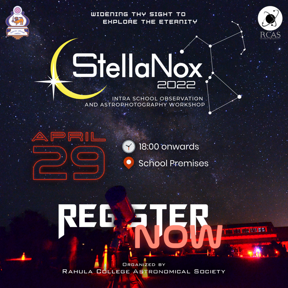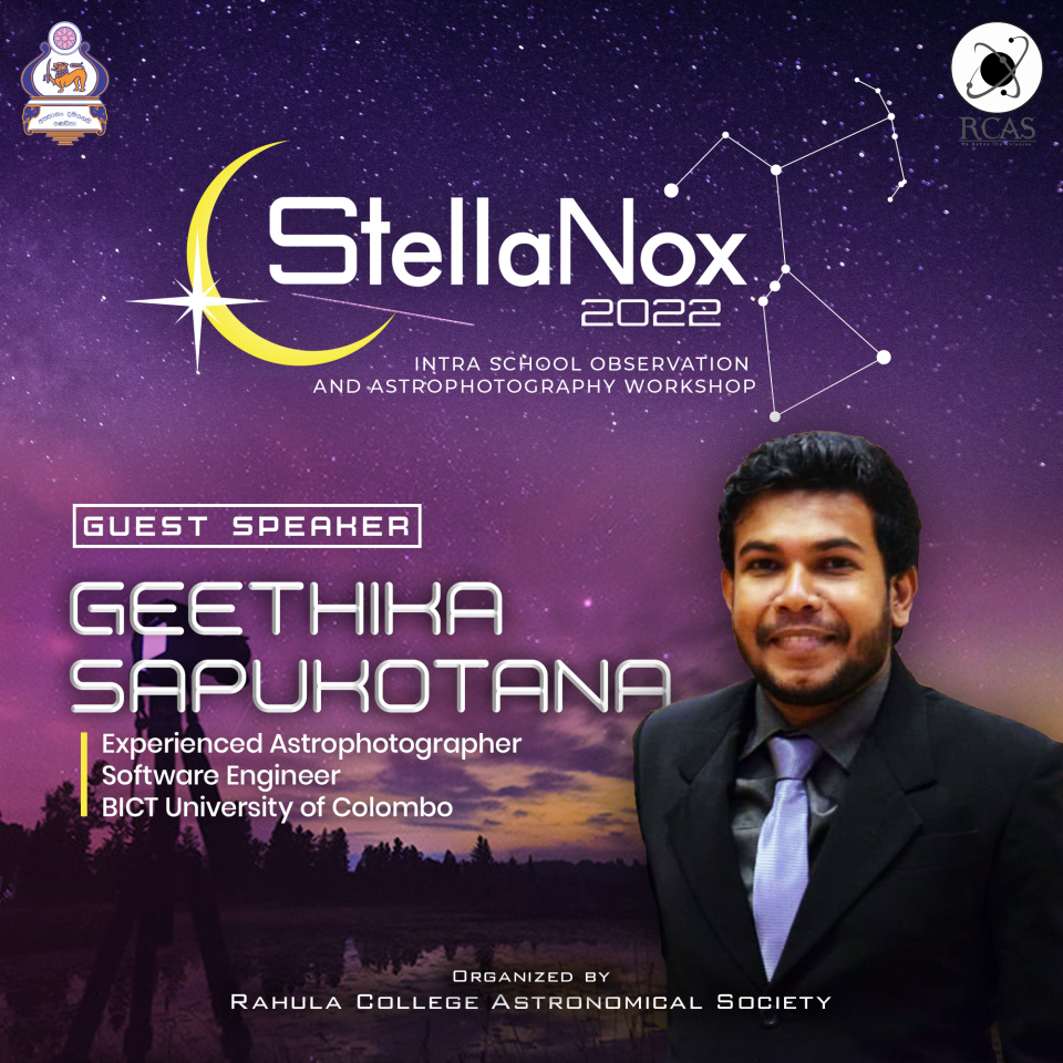 StellaNox 2022 අභ්යන්තර පාසල් තාරකා නිරීක්ෂන වැඩමුළුව. ගැඹුරු අහස නිරීක්ෂණයේ සහ තාරකා ඡායාරූපකරණයේ නිරත වන පළපුරුදු තාරකා ඡායාරූප ශිල්පියකු වන ගීතික සපුකොටන මහතා මෙම උත්සවය සඳහා අපගේ ආරාධිත කථිකයා ලෙස හඳුන්වා දීමට ලැබීම ගැන අපි අතිශයින් සතුටු වෙමු.